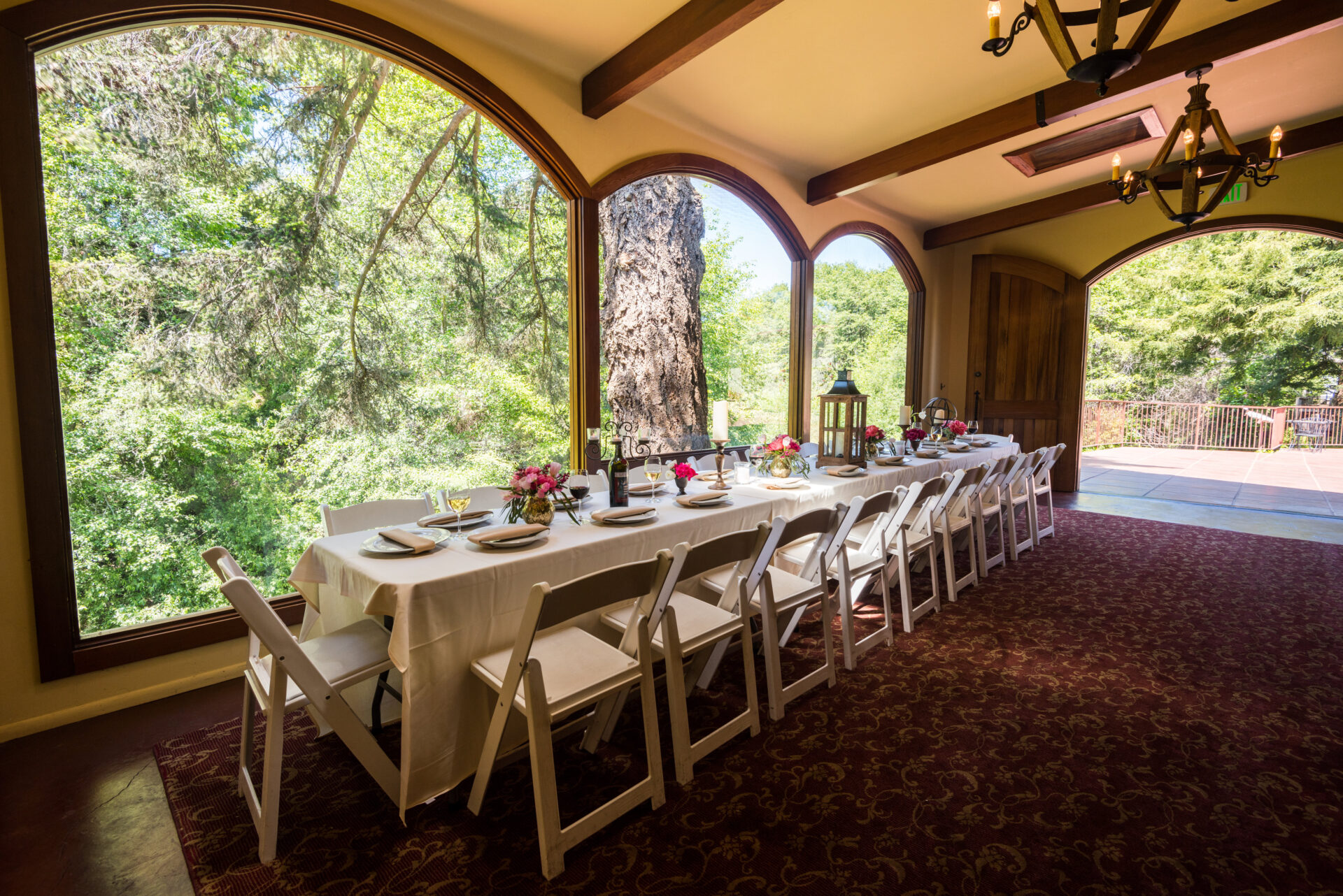 Curved burnished redwood doors open up to an elegant Mediterranean style room. The interior boasts exquisitely crafted chandeliers, ceiling beams and an entire redwood-lined wall. All the wood used in the room’s design has been recycled from antique wine tanks. Arched oversized windows overlook the creek bed.