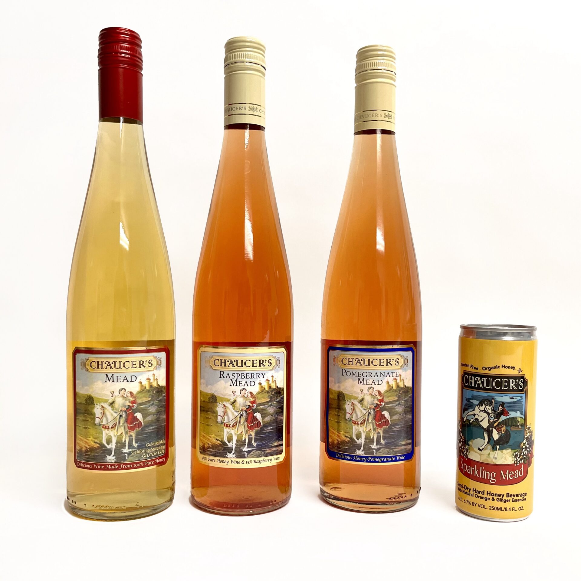 Chaucer’s Mead is produced from 100% natural honey. Our Raspberry Mead and Pomegranate Mead is a blend of our Mead and a small portion of fruit wine. Our Sparkling Mead is made from 100% organic honey with orange and ginger essences.